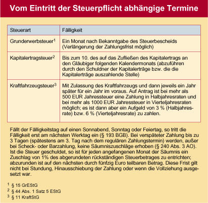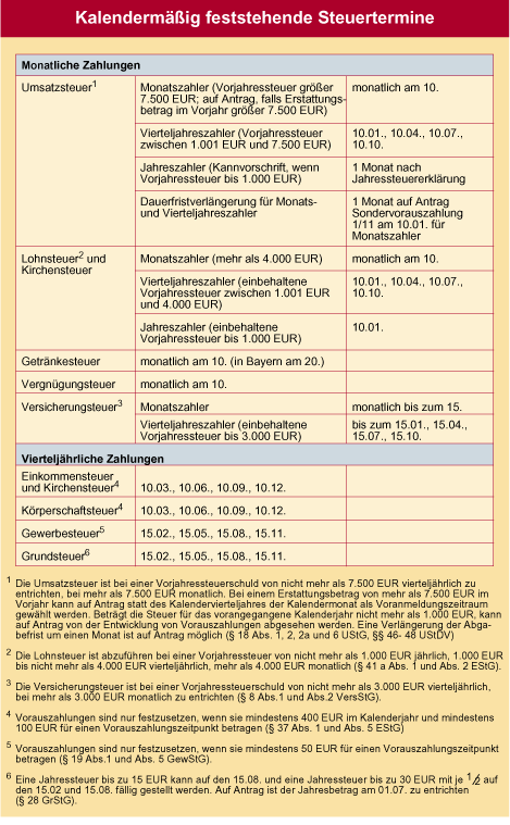 Im Folgenden erhalten Sie einen Überblick über die Termine, zu denen die unterschiedlichen Steuern zu zahlen sind. Bei Nichtzahlung bzw. nicht fristgerechter Zahlung drohen Säumniszuschläge.